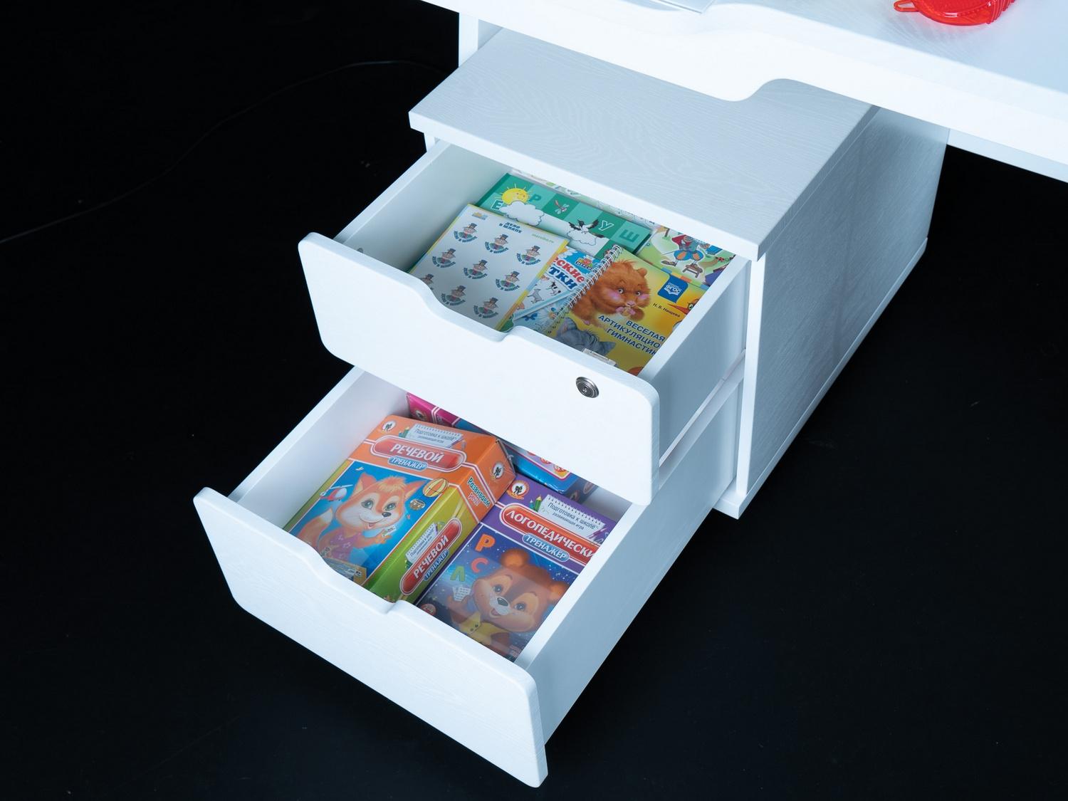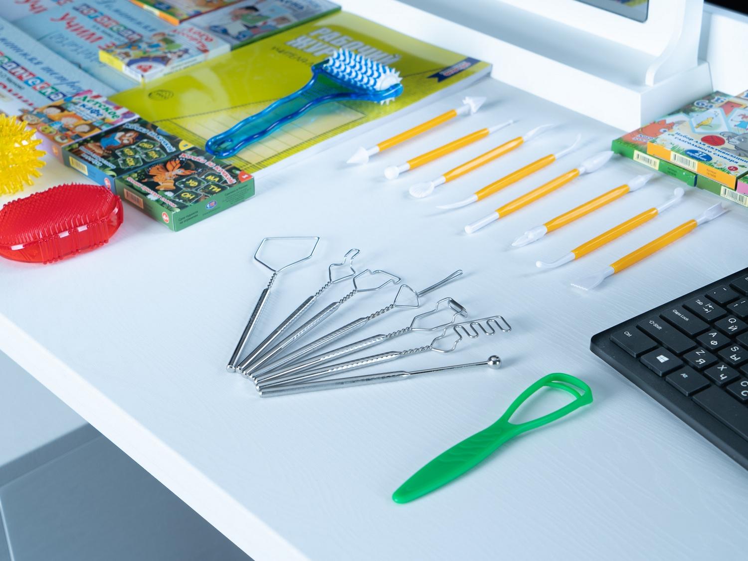 Рациональное оснащение. В комплектацию стола входит не только рабочее место специалиста с компьютером, но и детский стол со встроенной сенсорной панелью, акриловое зеркало, отсек для песочной терапии и полная тумба методических пособий и лого-инвентаря. Всё это обеспечивает максимальный комфорт и эффективность работы.