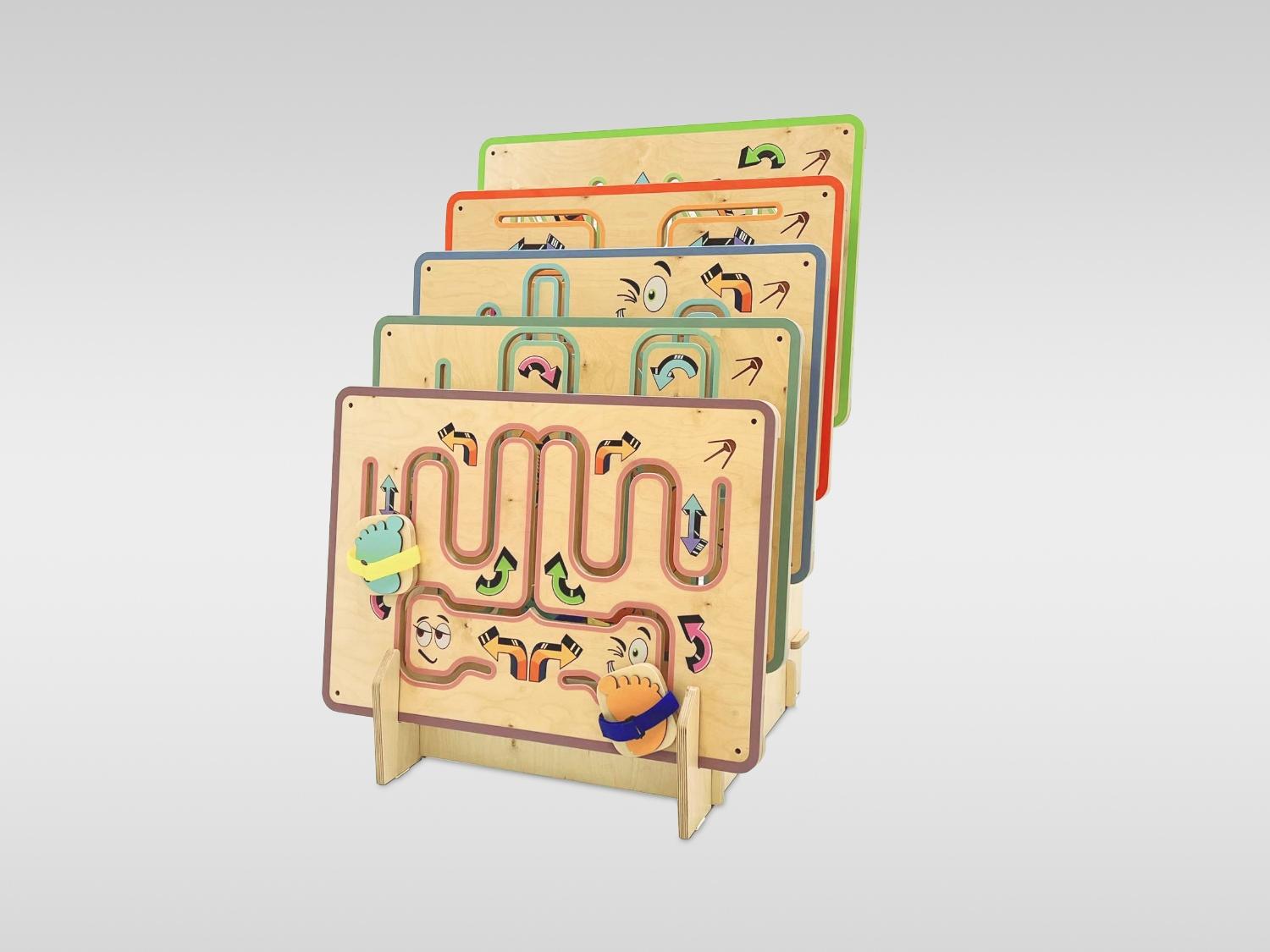 В комплекте идёт пять платформ-лабиринтов и подставка для них. Можно повесить все сразу, если позволяет помещение, можно только одну — и заменять платформы по мере надобности. В методическом пособии собраны варианты занятий, которые можно проводить с детьми.