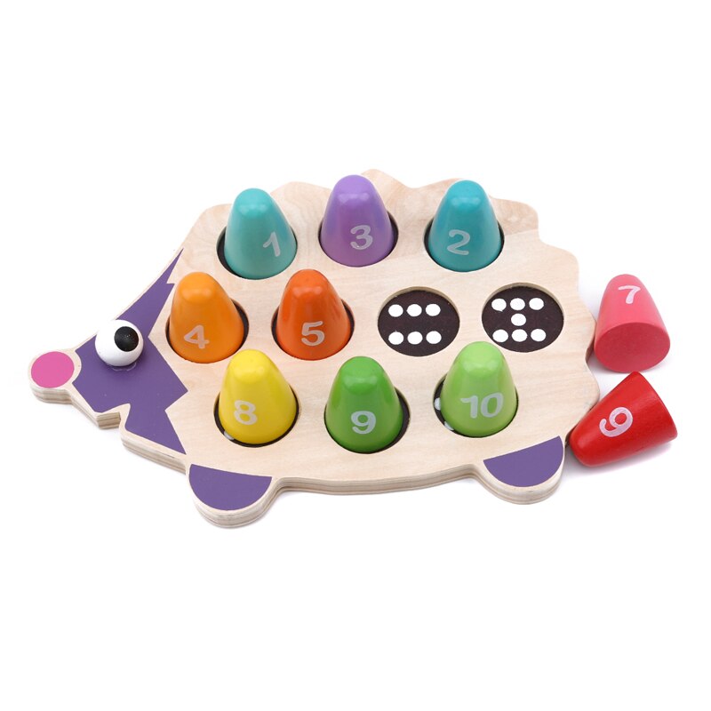 Забавный ёжик покрыт разноцветными пронумерованными иголками, для каждой из которых определена своя ячейка. В ячейках проставлены точки, количество которых соответствует номеру иголки - это для изучения цифр и счета. Все иголки отличаются по цвету. Используются основные цвета и оттенки: зеленого, желтого, красного и синего.